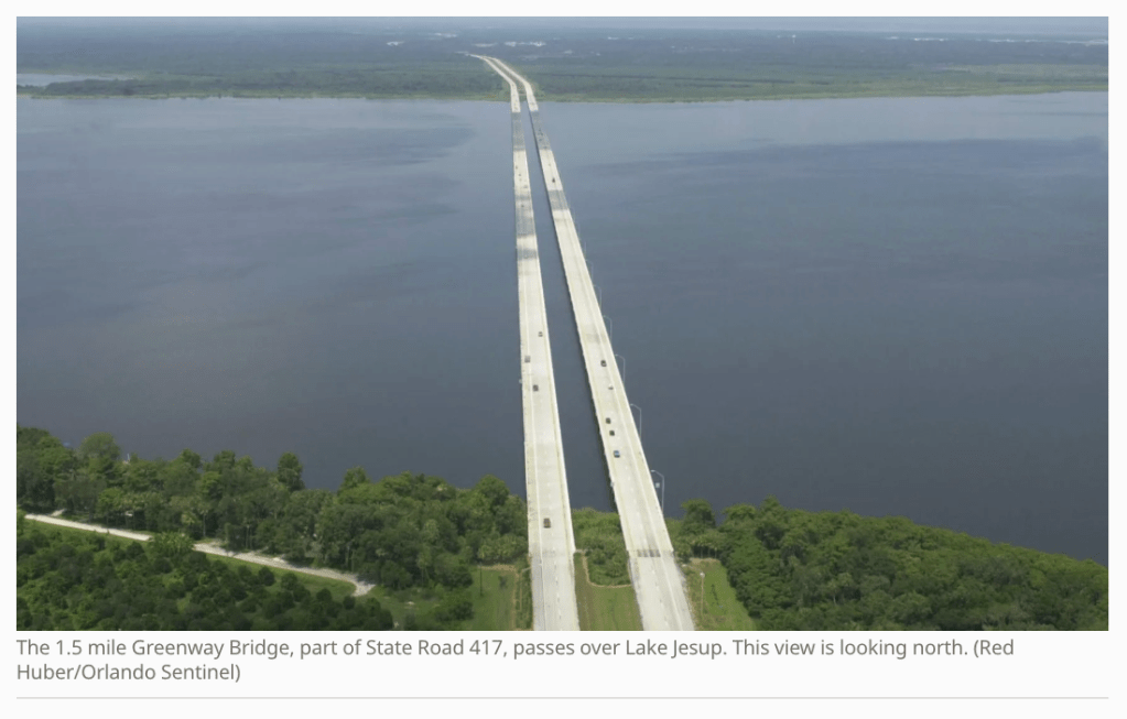 Today, the Seminole Expressway section of State Road 417 begins at Interstate 4 in Sanford, curves east of Lake Mary, and crosses Lake Jesup before winding its way south through Oviedo.